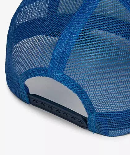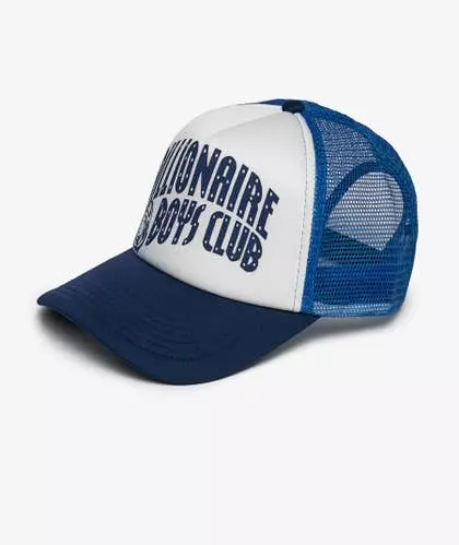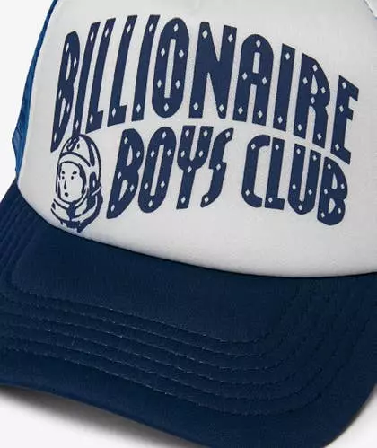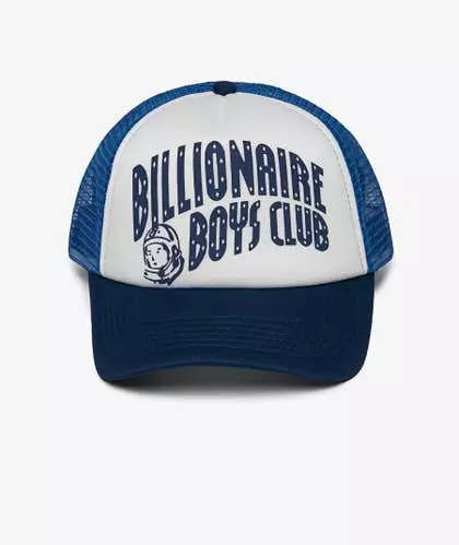Gorra de Billionaire Boys Club con construcción de 5 paneles, laterales de malla, cierre ajustable trasero y logo en el frente.