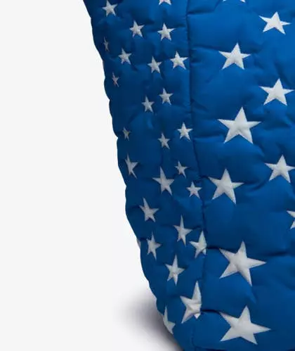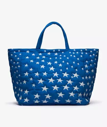 Bolsa azul acolchada de ERL confeccionada con poliéster y que cuenta con estrellas blancas en contraste y doble asa superior. Forro de tela del mismo azul que la parte exterior.