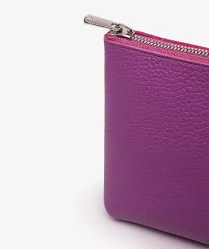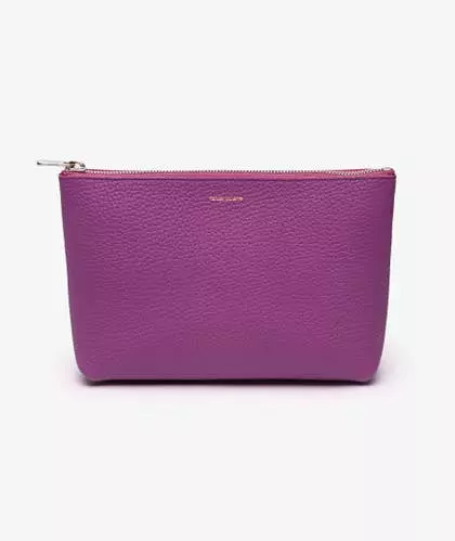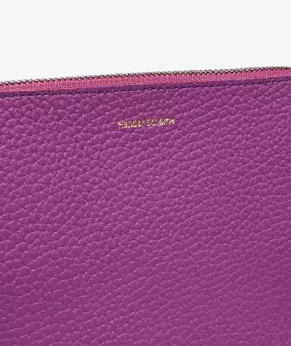 Bolso de mano lila de Hender Scheme de tamaño medio, ideal para ser utilizado también como neceser. Construido en cuero de vaca grueso y texturizado, cuenta con un cierre de cremallera, un logo plateado en el frente y un forro con acabado especial que evita que las fibras se peguen a los objetos contenidos en su interior.