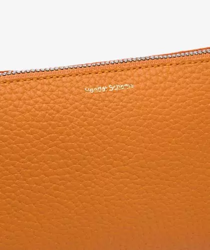 Bolso de mano pequeño naranja de Hender Scheme, ideal para ser utilizado también como neceser. Construido en cuero de vaca grueso y texturizado, cuenta con un cierre de cremallera, un logo plateado en el frente y un forro con acabado especial que evita que las fibras se peguen a los objetos contenidos en su interior.