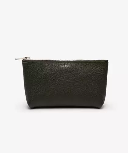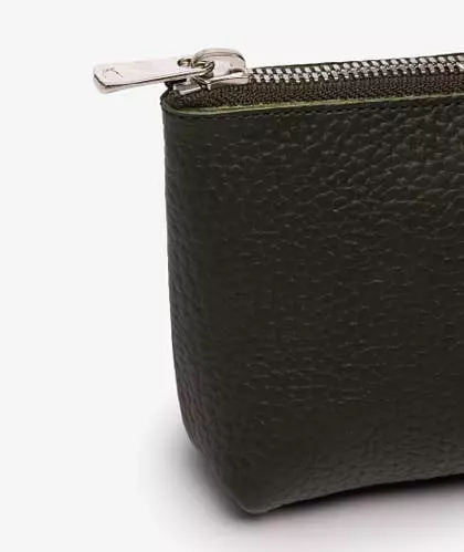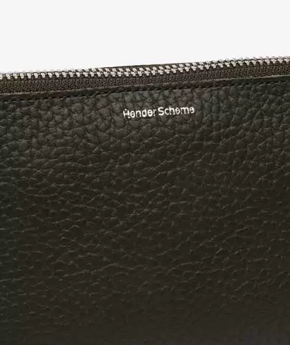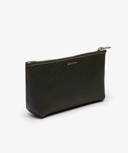 Bolso de mano pequeño verde de Hender Scheme, ideal para ser utilizado también como neceser. Construido en cuero de vaca grueso y texturizado, cuenta con un cierre de cremallera, un logo plateado en el frente y un forro con acabado especial que evita que las fibras se peguen a los objetos contenidos en su interior.