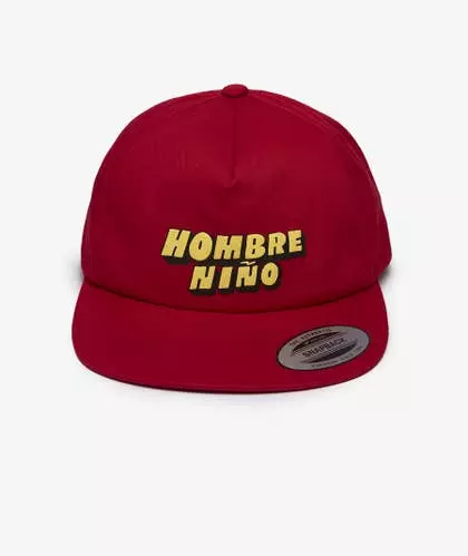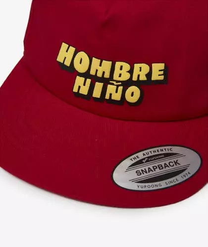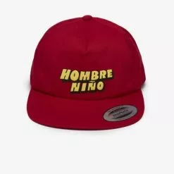 Esta gorra roja de 5 paneles y visera plana está elaborada con algodón prémium y tiene el logo de Hombre Niño estampado en la parte frontal.