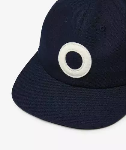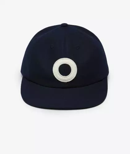 Gorra azul de seis paneles de POP Trading Company con el logo de la marca bordado en la parte trasera y la O de POP en la parte delantera.