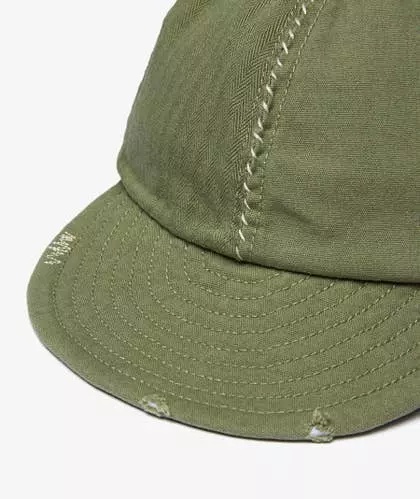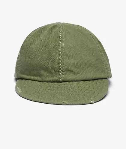 Gorra de tela con ilustración de Nigel Cabourn en el lateral y detalles de desgaste. Visera curvada y cierre de botón ajustable.