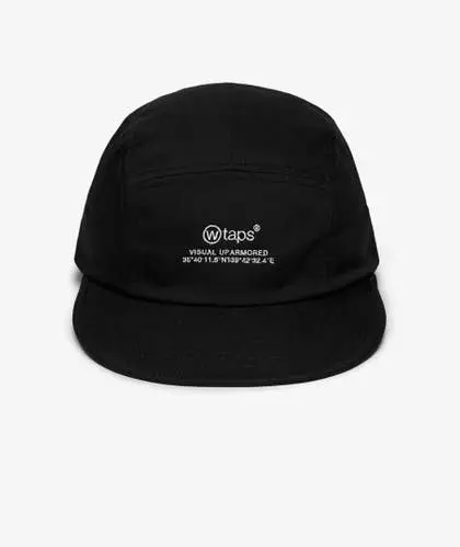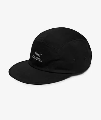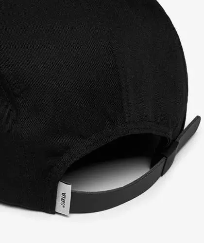 Gorra Negra de WTAPS de 5 paneles, con una correa ajustable en la parte trasera y bordado en la parte delantera.